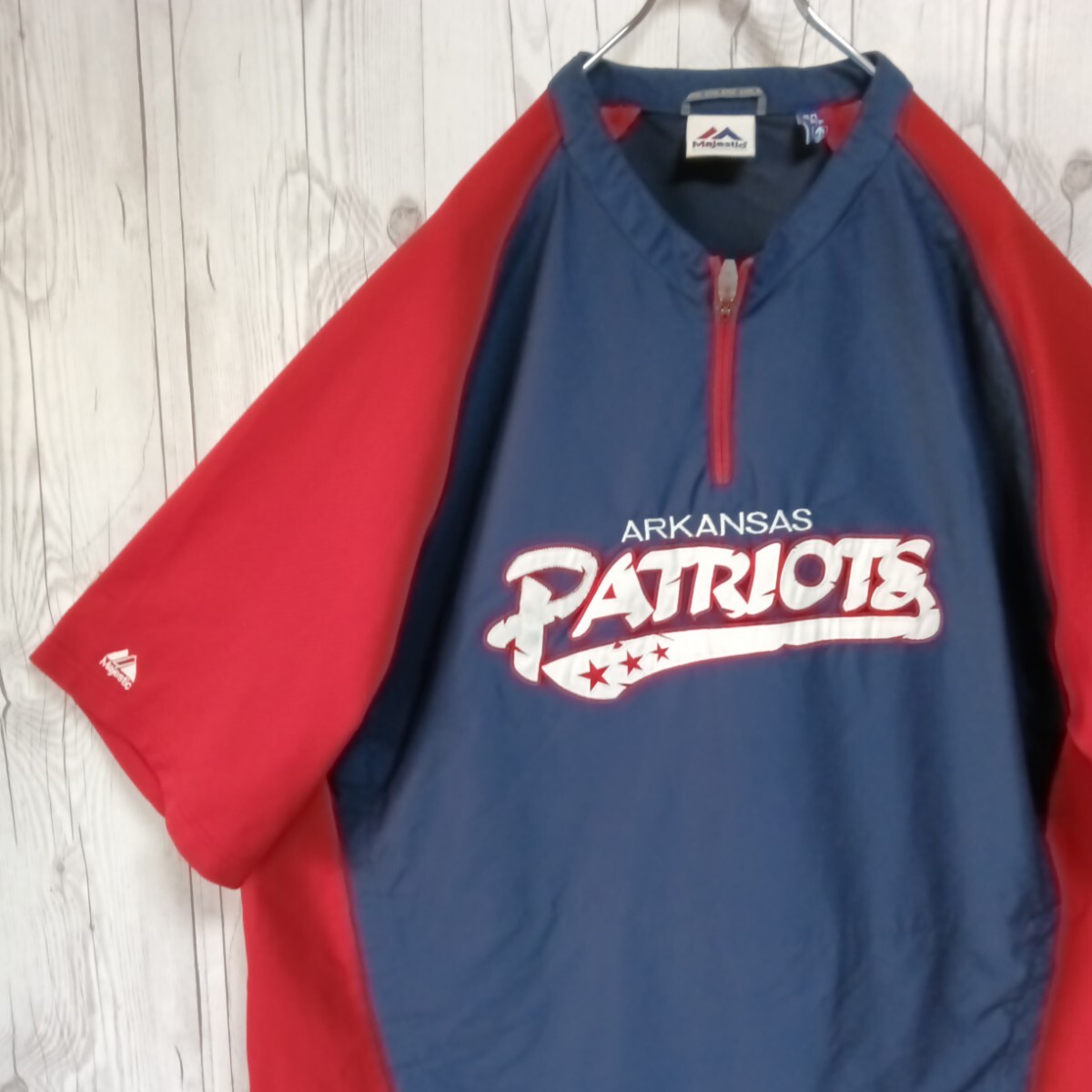 > Majestic ナイロンハーフジップ 半袖シャツ メンズXL~XXLサイズ相当 ベースボール 野球 紺 ネイビー マジェスティック 古着