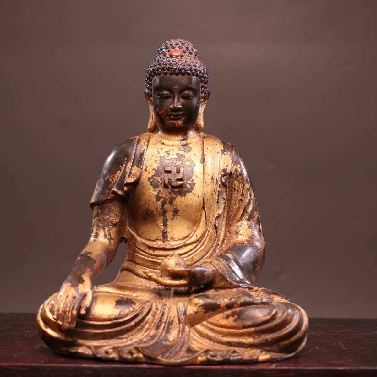 - ▽鴻▽ 銅製 泥金 朱砂 釋迦如來仏祖像 仏像 宗教 仏教古美術 供養品 古賞物 古董品 時代物 稀少珍品 中国古玩 中国古美術