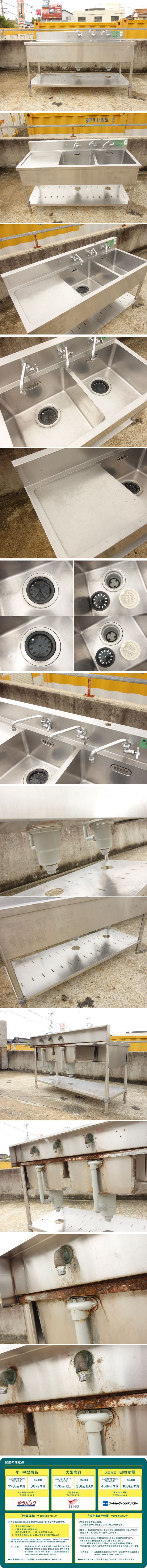 > 【中古】M▼業務用 厨房 流し台 シンク ステンレス 二槽 2槽 水栓 バックガード 幅1500×奥行600×高さ790~940~975 (Fe1939)
