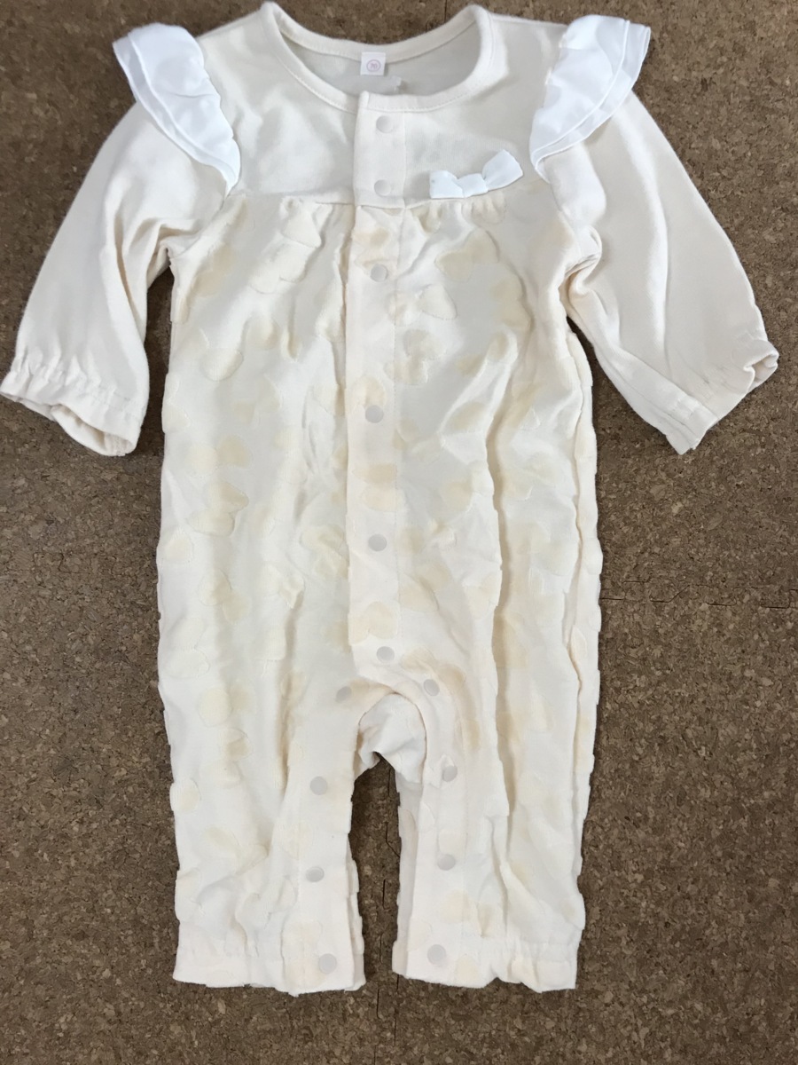 - [ ベビー服] 西松屋 ロンパース 前開き 女の子用[ サイズ: 70 体重: 9Kg] クリームベージュ系 リボン柄 シミ有り 1点 送料無料 n49