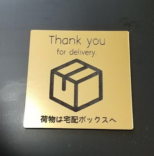 - アクリル製 ポストプレート 玄関 宅配 ドア プレート 5cm×5cm 荷物は宅配ボックスへ ゴールド ステンレス 案内 注意 送料無料