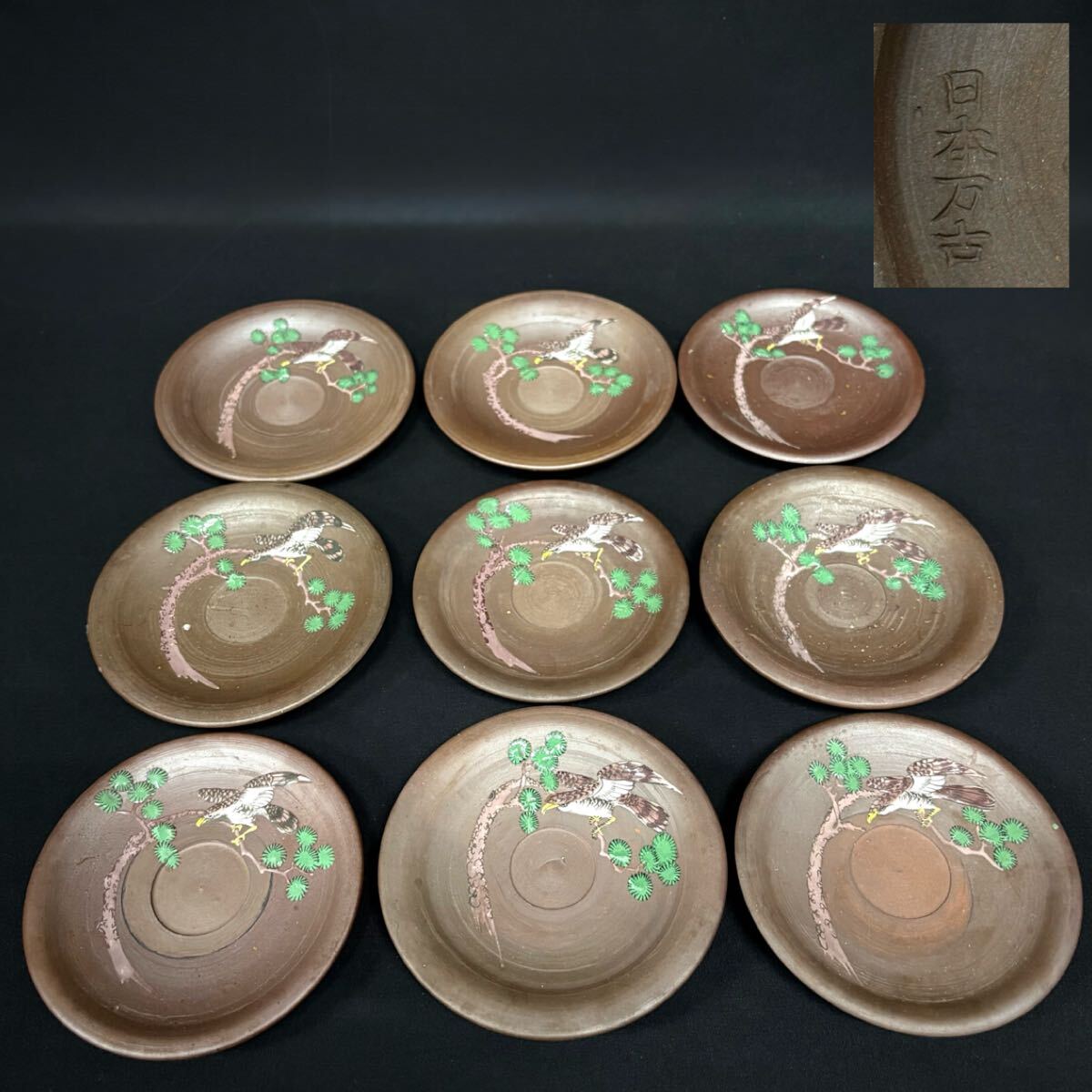 > 明治期 萬古焼 日本万古印 紫泥 彩色 松に鷹 手塩皿 9客セット 小皿 銘々皿 茶托 時代物 (09197Y