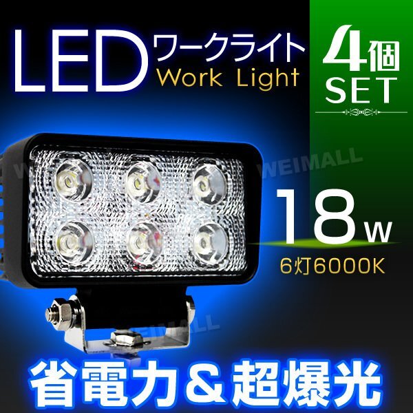 > 【4個セット】省電力 LED ワークライト 18W 投光器 12V/24V 広角 6連角型 照明 投光器 ライト 集魚灯 作業灯 ナイター 新品 未使用