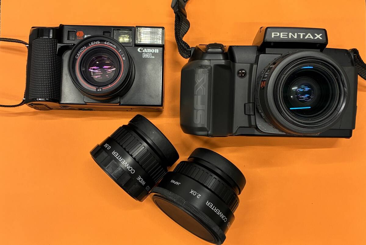 - ★カメラ2台・レンズ2個セット【中古品】動作未確認 Canon AF35ML・ PENTAX SFX・ワイドコンバーター0.5X・ワイドコンバータ2.0X