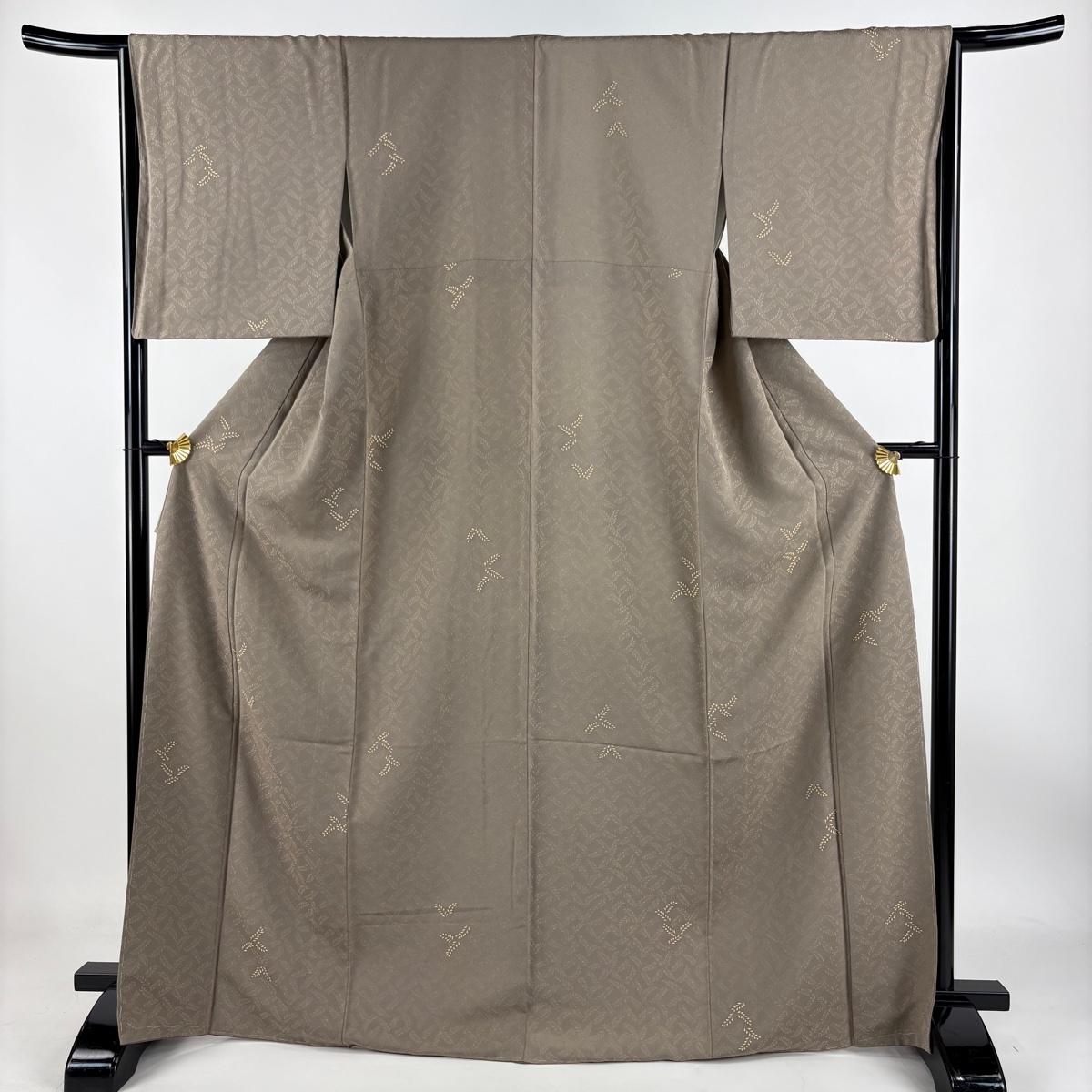 - 小紋 身丈167cm 裄丈66cm M 袷 葉柄 地紋 薄茶色 正絹 秀品 【中古】