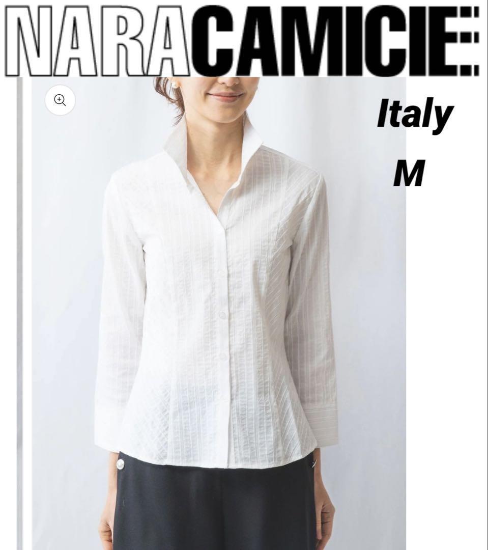 - NARACAMICIE ナラカミーチェ イタリア製 ストライプ スタンドカラー 七分袖シャツ 白 M