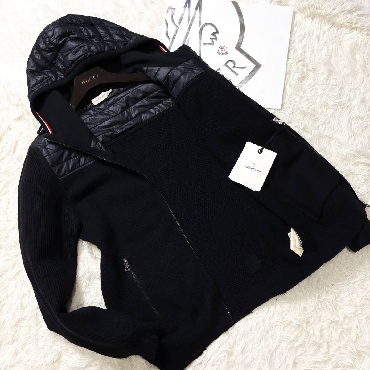 - 幻級XXL~XL!MONCLERジップアップカーディガン部分ダウンドッキングパーカー認証済み確実正規品LLネイビー袖ロゴワッペン濃紺モンクレール