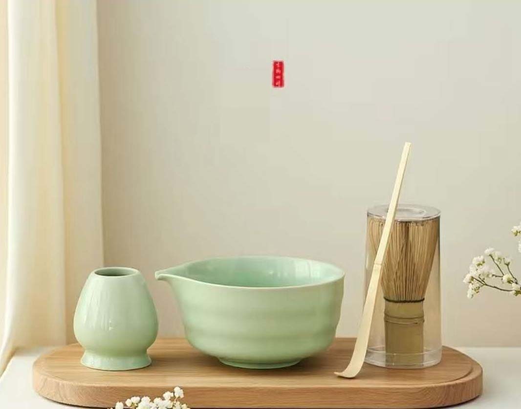 - 【4点セット】抹茶セット 茶道具 初心者 自宅用 お点前セット 抹茶茶碗 百本立 茶筅立て お手入れも簡単(色:グリーン)YS45