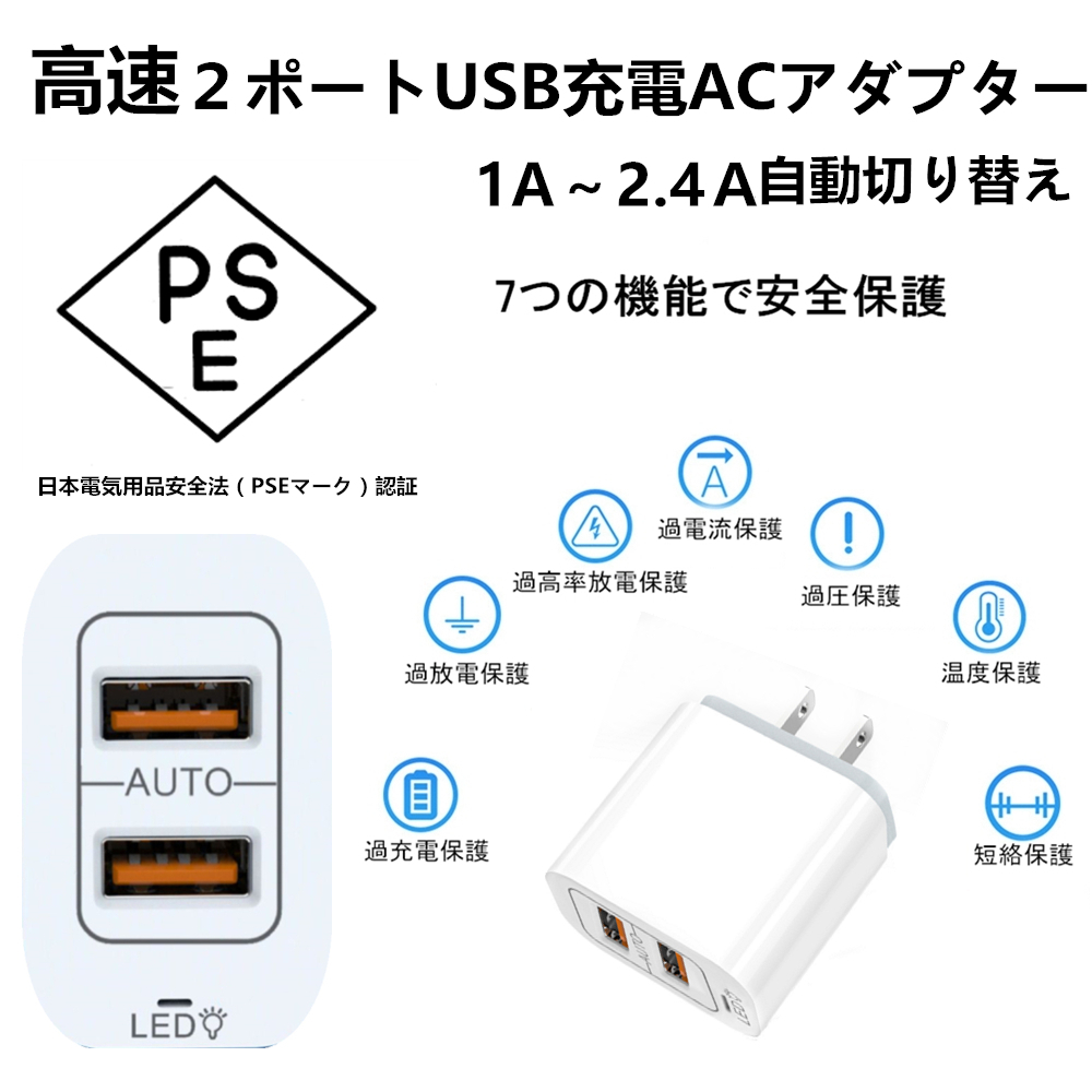 - 2個入り 電源アダプタ 充電器 自動判別 USB 充電器 ACアダプター ポート2口タイプ 急速 PSE認証 2.4A PSE認証
