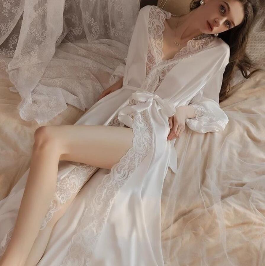 - 人気推薦/レディース セクシー ロング丈 レース Vネック メッシュ 薄手 サテン バスローブ パジャマ ナイトウェア ルームウェア 部屋着/ 白