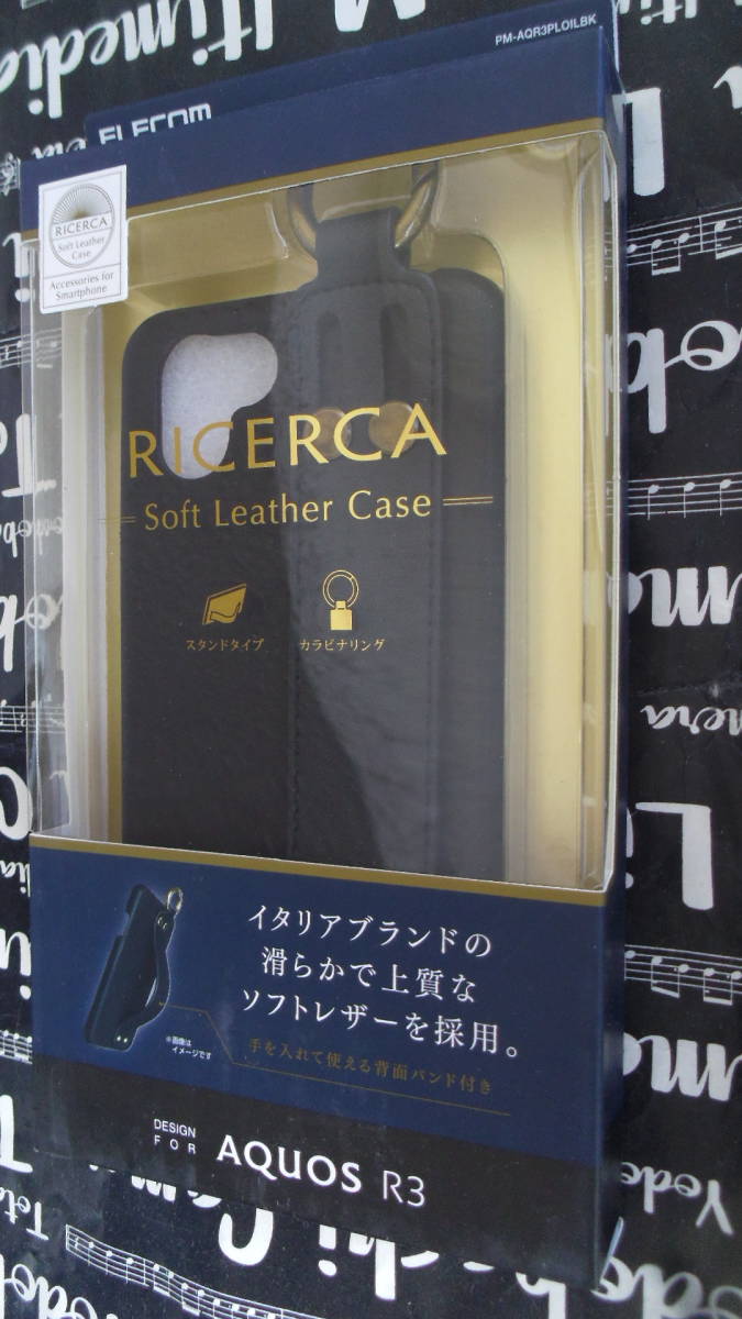 > ELECOM AQUOS R3 SHV44 SH-04L CORONET社製イタリアンソフトレザー ネロ色 アンティークゴールド調の金属パーツを使用した落下防止バンド付