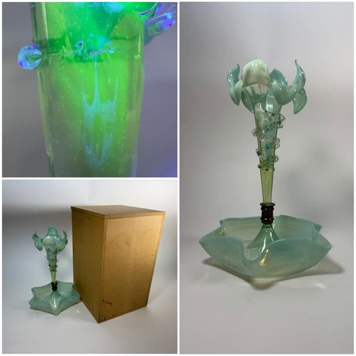 > AS638 ウラン硝子 ウランガラス コンポート 一輪挿 ガラス花瓶 ヴィンテージ オブジェ ワセリンガラス エパーニュ H29cm