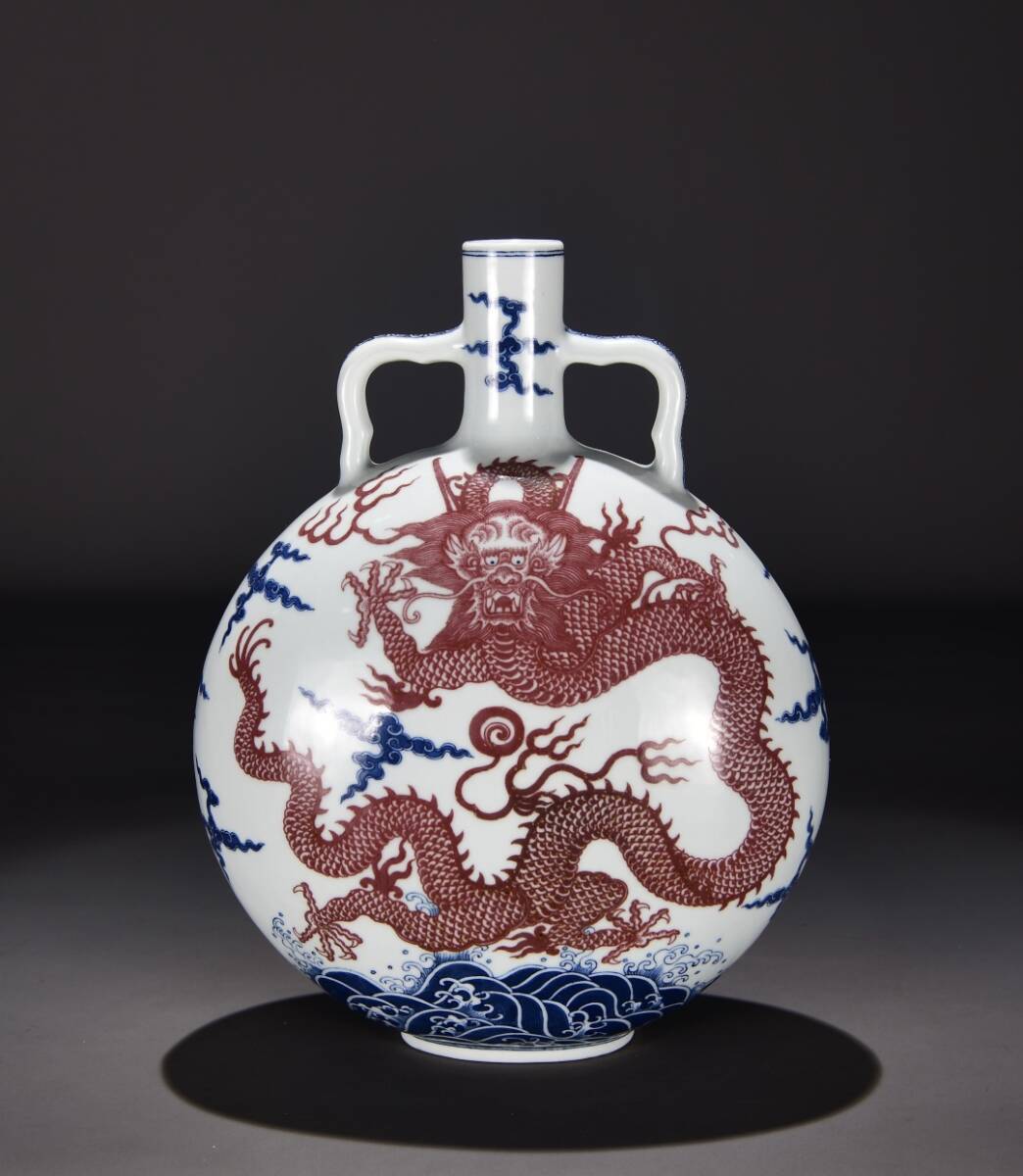 - 清時代 乾隆年製款 古陶磁器 龍紋 青花 花瓶 釉裡紅海水龍紋 抱月瓶 磁器 陶芸 擺件 時代物 古董品 骨董 旧家蔵出 唐物 中国古玩 古美術品