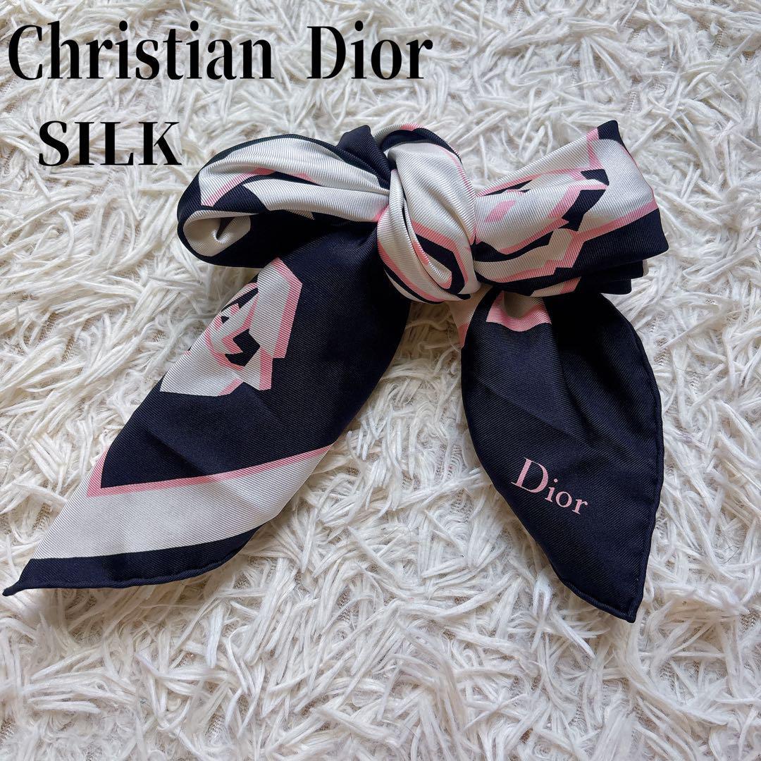 - Christian Dior クリスチャンディオール シルク SILK スカーフ 総柄 花柄 フローラ ボタニカル ブラック ピンク