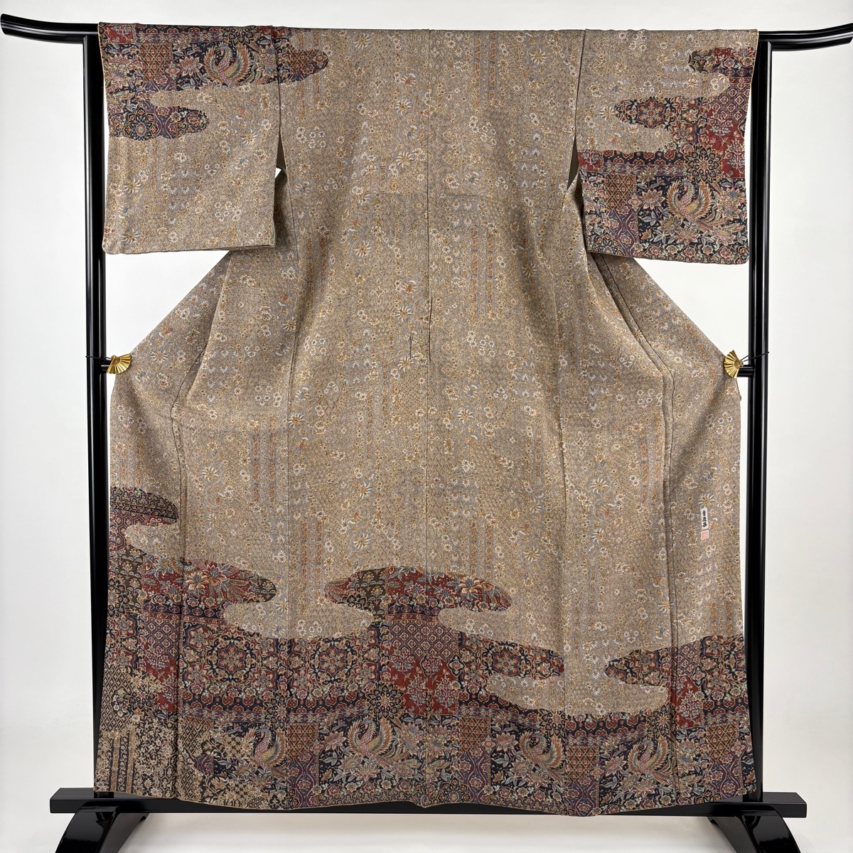 > 訪問着 身丈159cm 裄丈63.5cm S 袷 二代目 更甚 落款 更紗柄 ヱ霞 染分け 縮緬 灰茶 正絹 美品 秀品 【中古】