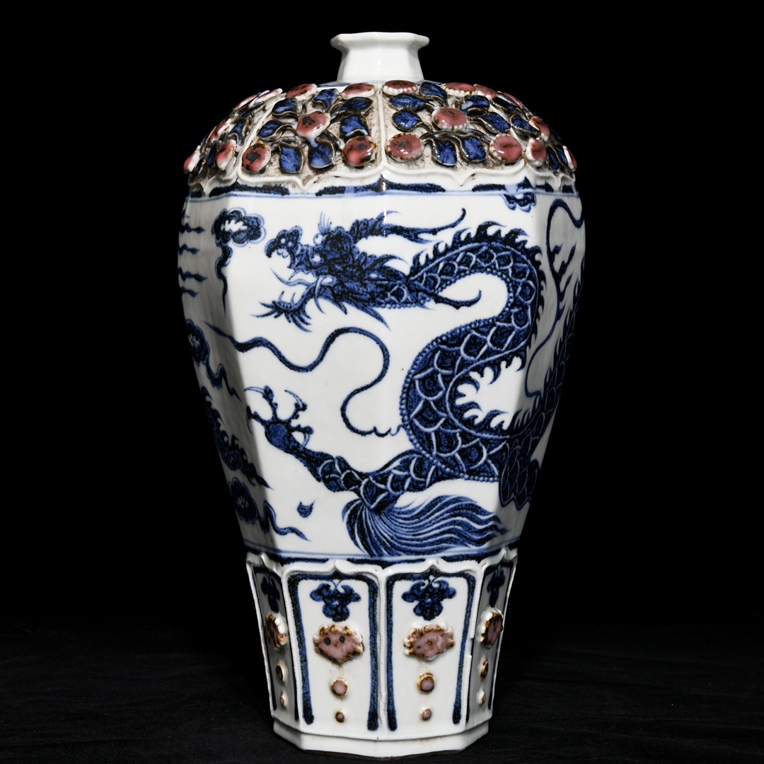 - 秘蔵 元時代 青花釉里赤摘花龍紋八方梅瓶花瓶 33.5cm古陶磁器 陶芸 唐物 古賞物 時代物 骨董品古置物 極細工 中国磁器 古美味 中国古玩922