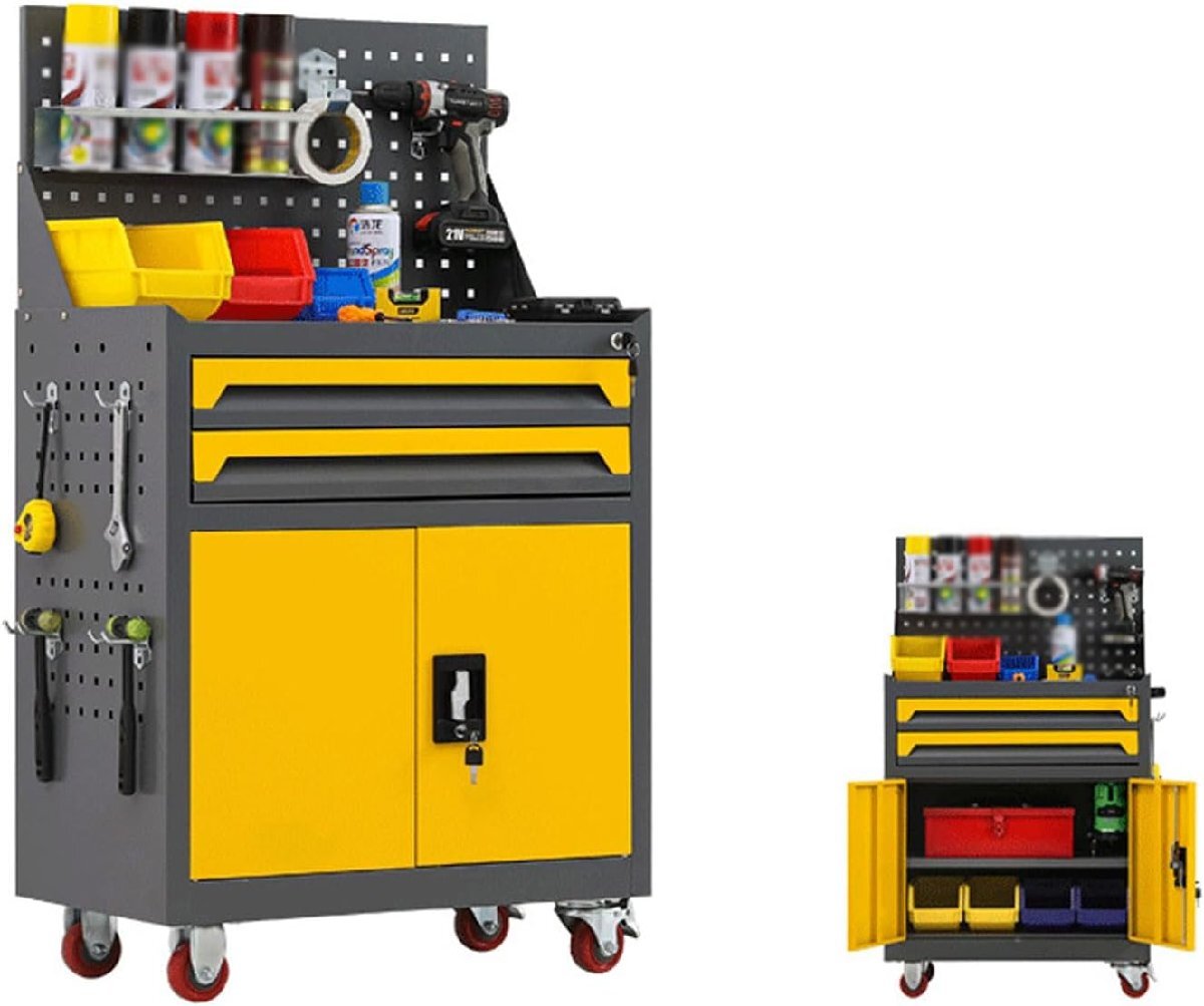 - ハードウェア修理カートボックス 頑丈な自動車修理ツールカート 2つの引き出し付き 多機能メンテナンスツールテーブル 2つのドアとホイール