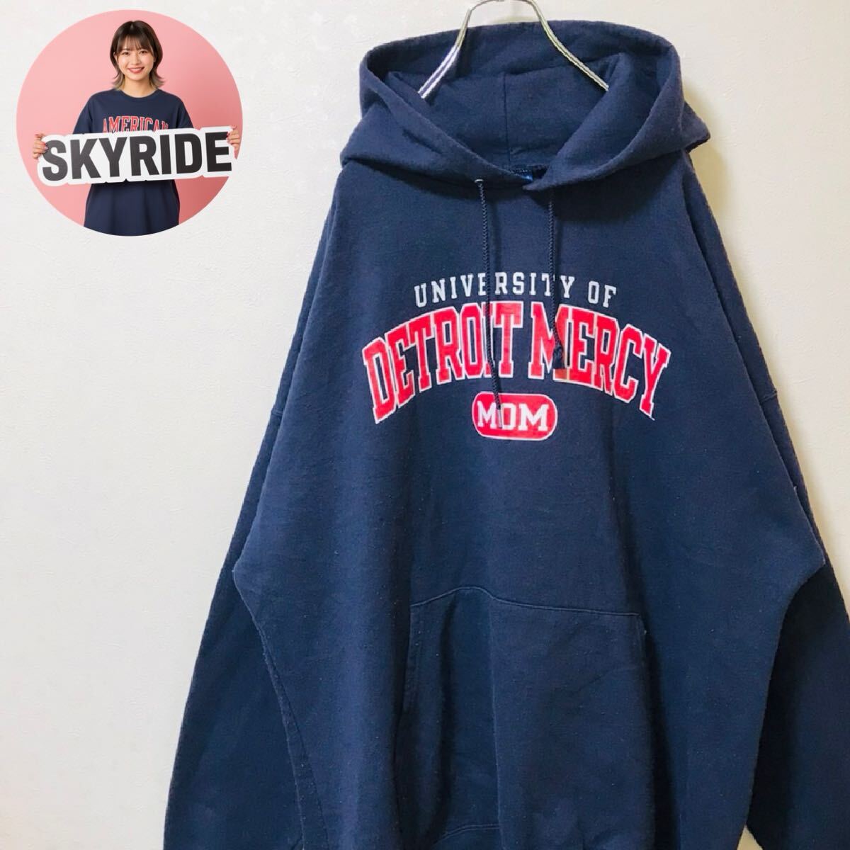 - 【人気】Champion チャンピオン パーカー ネイビー 3XL ビッグシルエット カレッジロゴ プルオーバー ゆるだぼ ストリート 古着 #TT0323