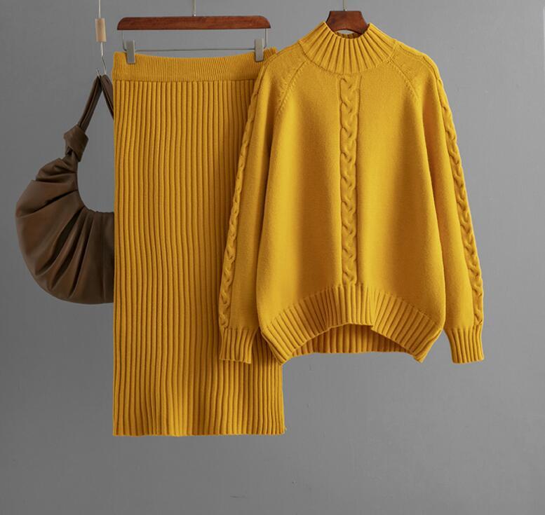 > 346 スカートスーツladiesレディース ◇ 秋冬 上質 ◇ 暖かい 厚手 ニット素材 ケーブル編み イエロー