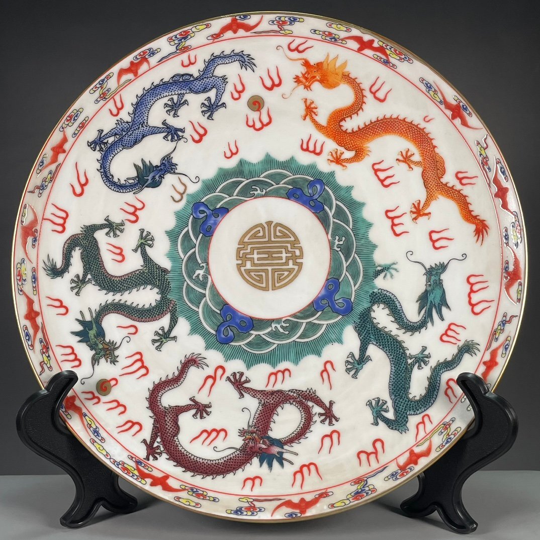 - 景徳鎮 お皿 観賞皿 清 乾隆年制 五竜紋賞皿 賞盤 賞皿 全品 龍柄 磁器 陶磁器 観賞 置物 中国美術品 収蔵 外国回流