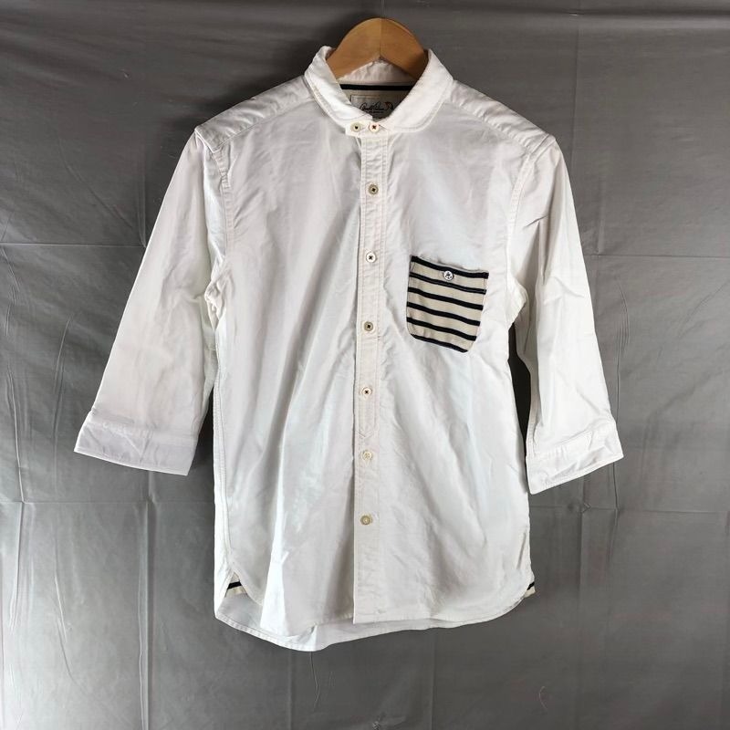 - アーノルドパーマー Arnold Palmer シャツ 七分袖 デザインポケット ボーダー 刺繍 イカリマーク 綿100% 白系 2サイズ 2025083000080