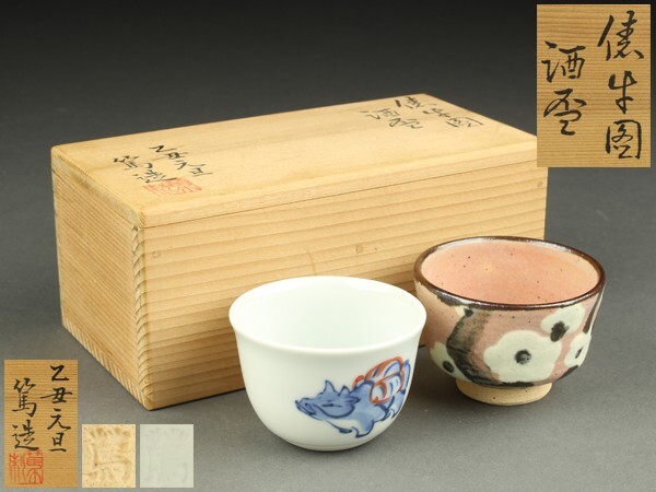 - 【宇】936 三浦篤造 俵牛図 酒盃一対 共箱