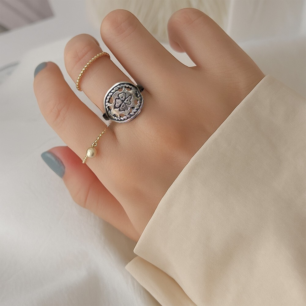 > ロープと四つ葉のクローバー 透かし 925 シルバー ヴィンテージ オーバル リング 銀 指輪 Lucky Clover レトロ 自然派 Y13-G