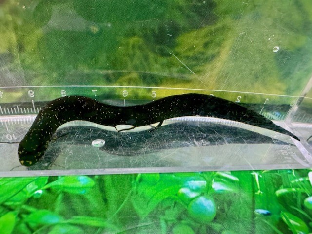 レピドシレンは細長い紐状の胸ビレと腹ビレを持つ、南米大陸に生息するハイギョです。幼魚は黒い全身に黄色い水玉模様が入りますが、成長と共に黄色い模様は消失していきやがて全身が黒色(灰色)一色になっていきます。