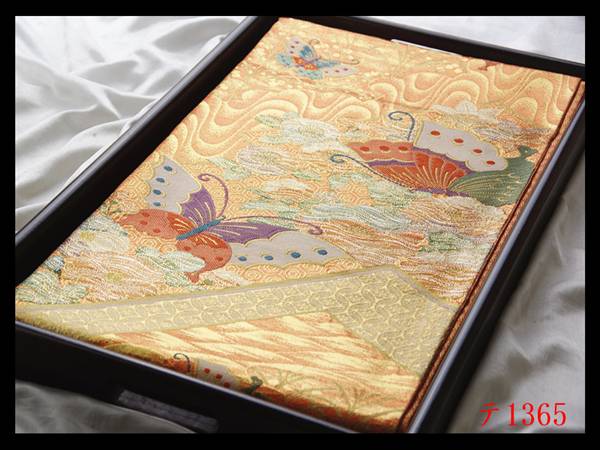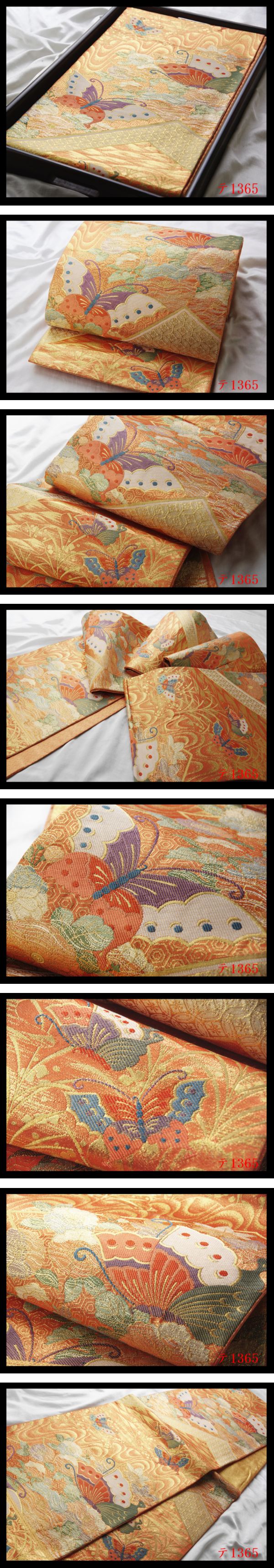 - 蔵【テ1365】西陣逸品 振袖可 蝶紋 鉛丹色地 気品豊かに 正絹純金糸六通高級美術袋帯 ◇検◇簪着物名古屋帯和装小物帯締め