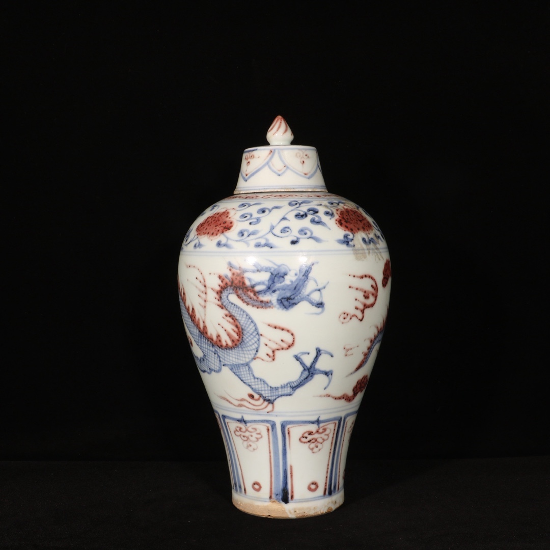 - 元時代 青花 染付 釉里紅 雲龍文梅瓶 唐物 箱付き 陶磁器 中国美術 古美術 置物 骨董品 高さ32cm 直径15.5cm RG1033