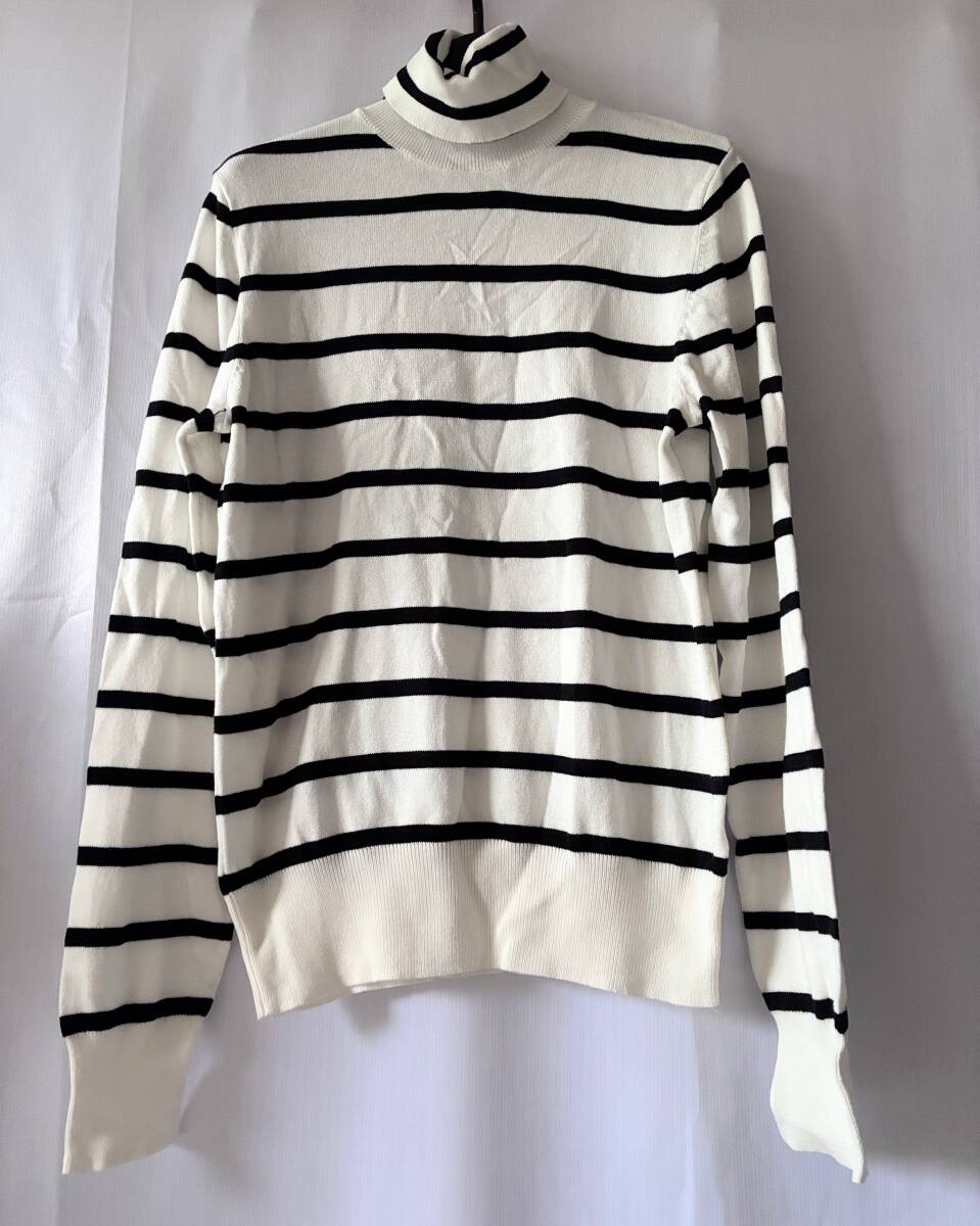 > 未使用 H&M エイチアンドエム 長袖タートルネックセーター 袖先/裾リブ編み 裾/ストレートヘム 伸縮 白&黒ボーダー 着丈59 身幅46 S M~L近