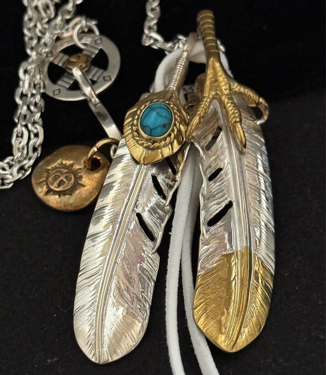 - シルバー925 金爪 フェザーネックレス ターコイズフェザー 金イーグルメタル 太角チェーンセット