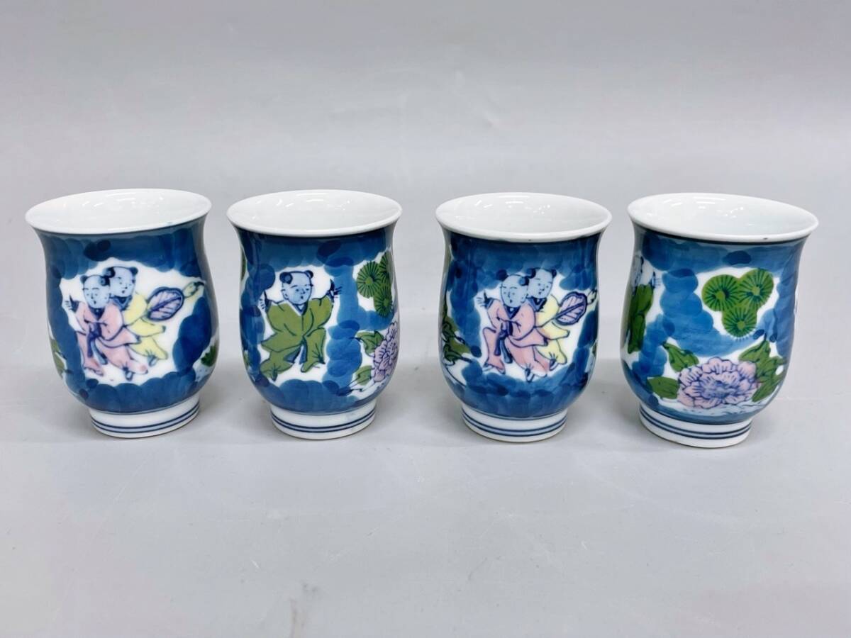 - お猪口 4客 酒器 盃 杯 唐子絵 牡丹 3人唐子 染付色絵 ぐい飲み 陶器 食器 和食器