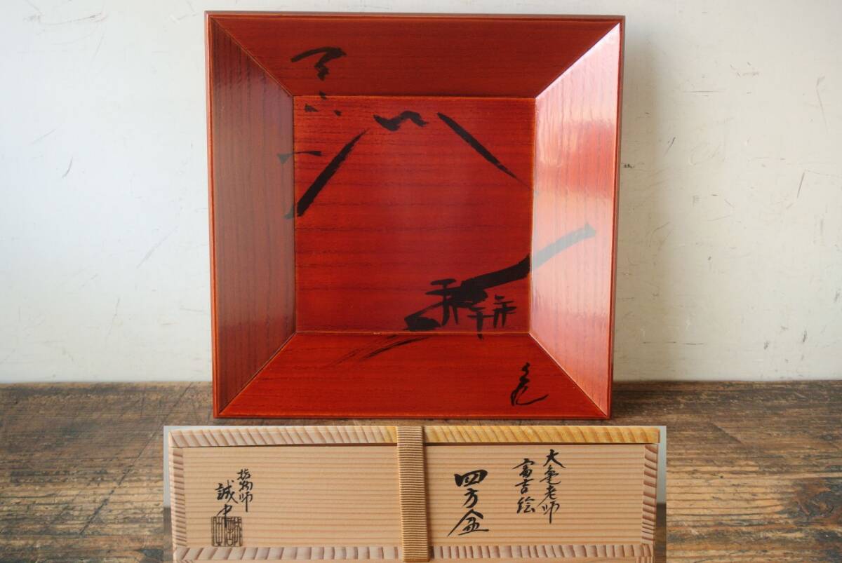 指物師 三代 稲尾誠中齋 大亀老師 富士の絵 四方盆 共箱 共布 栞 共箱 本物保証 です。