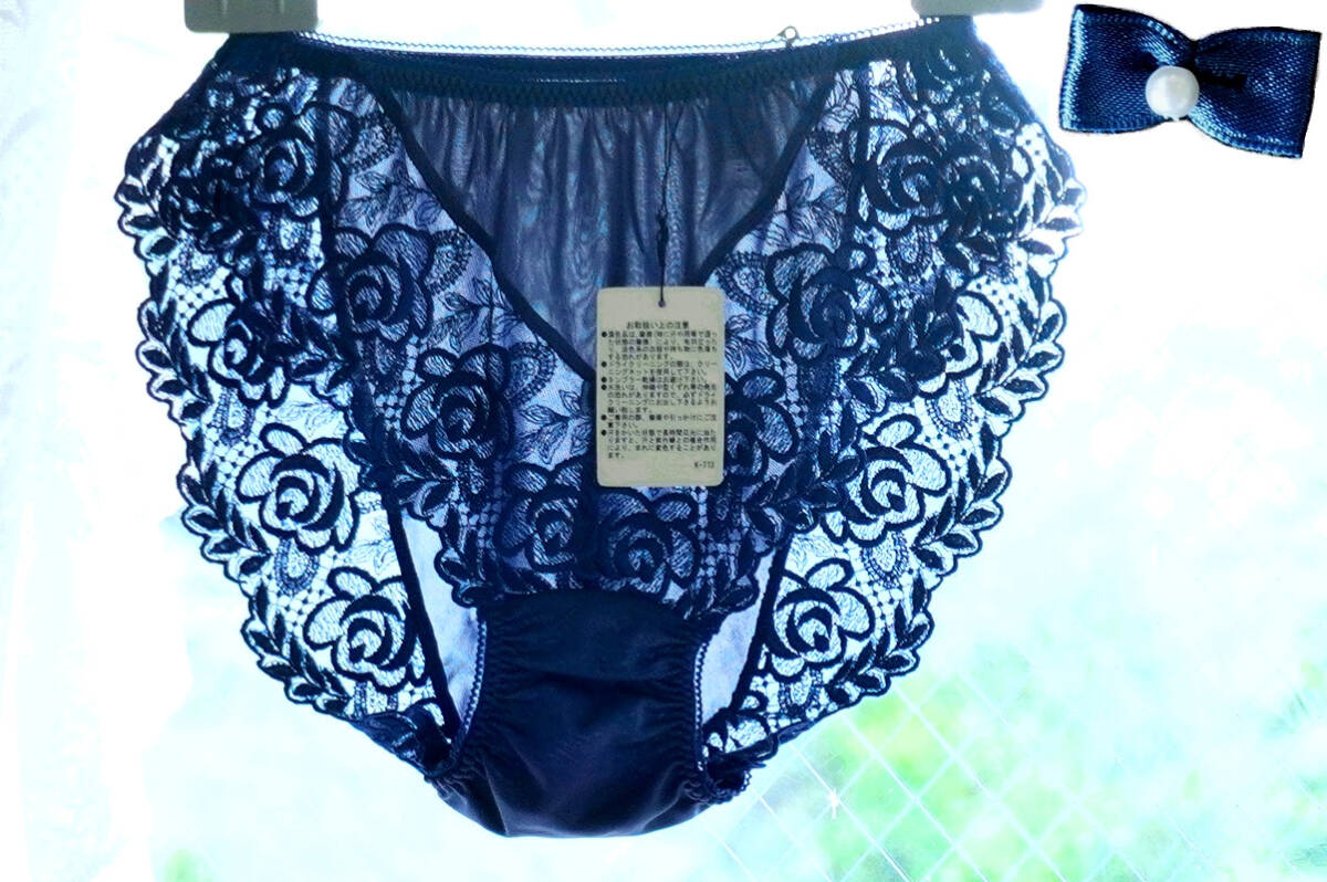 - 日本製*メーカーさん不明ですがとっても可愛い光沢サテンxレースのスタンダードショーツ*ノーマルショーツ*艶めく紺色*パールリボン付伸縮M
