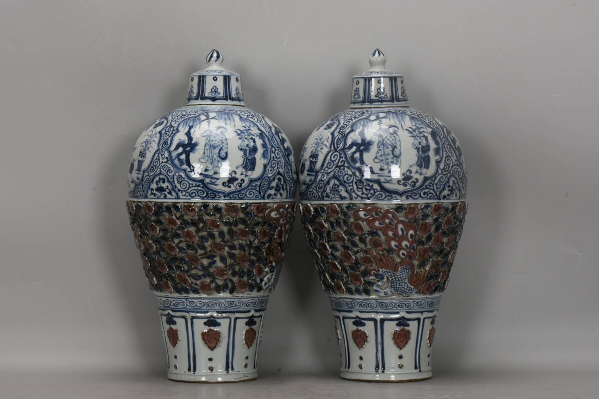 > ◆珍蔵◆古美術 元代 元青花 釉里紅 捏花 古陶磁 四愛人物故事紋梅瓶―對 精品 細密細工造 置物 擺件 骨董品 古賞物 時代物 A3