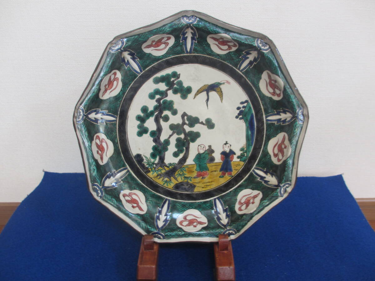- 古九谷皿 青手古九谷「鶴・松・唐人図」在角福銘 時代物 古美術品