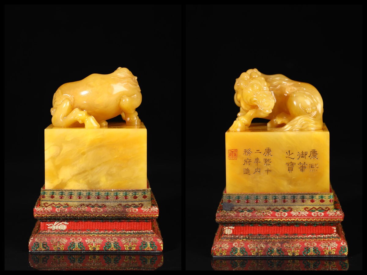 - 「清 康熙十二年内務府造 老寿山石 田黄石彫り 古獣鈕印章 印璽」極細工 擺件 古賞物 中国古美術 旧蔵出