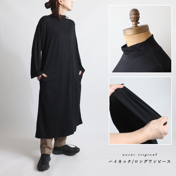 - 秋の新作 スムース伸縮ストレッチ Tシャツ カットソー生地 ハイネック ロングワンピース ゆったり ブラック黒 K12