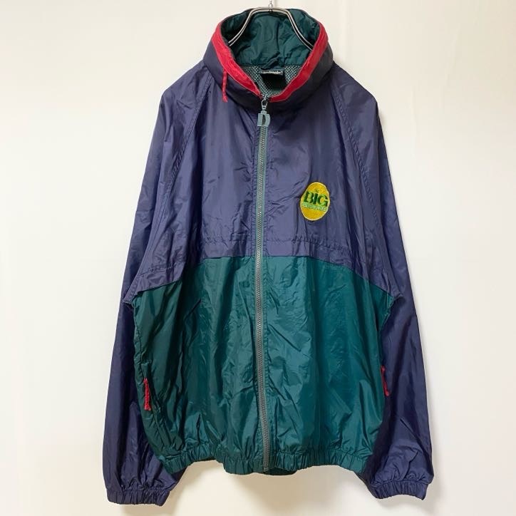 - 古着 used Dunbrooke ダンブルック 長袖ハイネックナイロンジャケット ワンポイント刺繍 フード収納 ネイビー 緑
