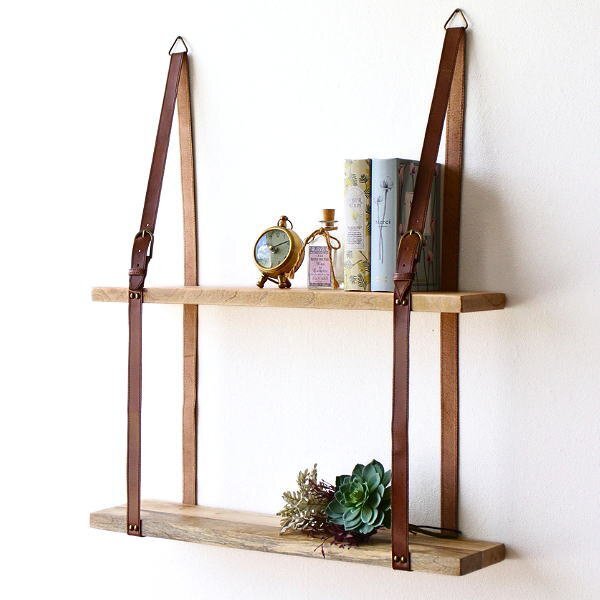 - ウォールシェルフ おしゃれ 2段 壁掛け棚 幅70cm以上 大きめ 木製 本革 木とレザーの壁掛けシェルフ 送料無料(一部地域除く) ras1774