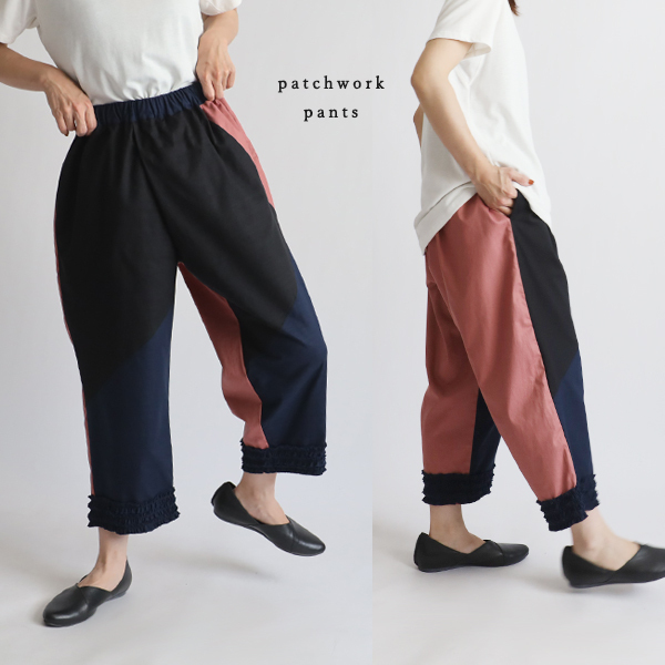 - 最終SALE 愉快なパンツ祭り 80cm ギマ擬麻コットン パッチワーク パンツ 小花フリル裾 斜めクロス ペチ Y41C