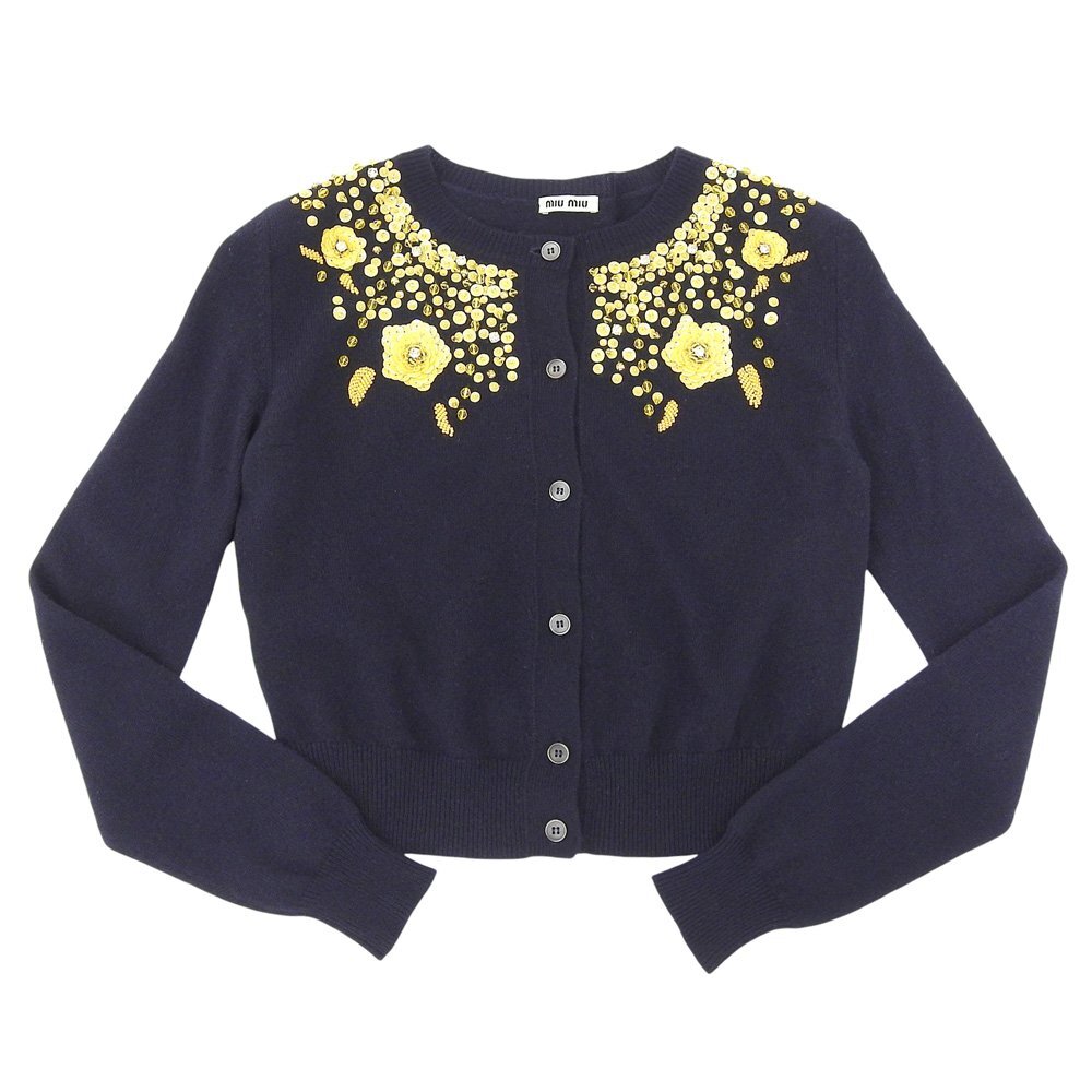> r7h022706◆MIUMIU ミュウミュウ スパンコール&ビーズ飾り付き ニット カーディガン カシミヤ ネイビー イエロー レディース 36