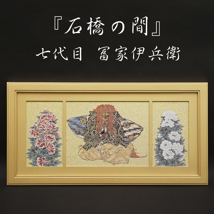 - 西陣織 七代目 冨家伊兵衛 正絹 『石橋の間』 巴つづれ 白牡丹 紅牡丹 額装 アート 時代 骨董 帯 美品 古美術品