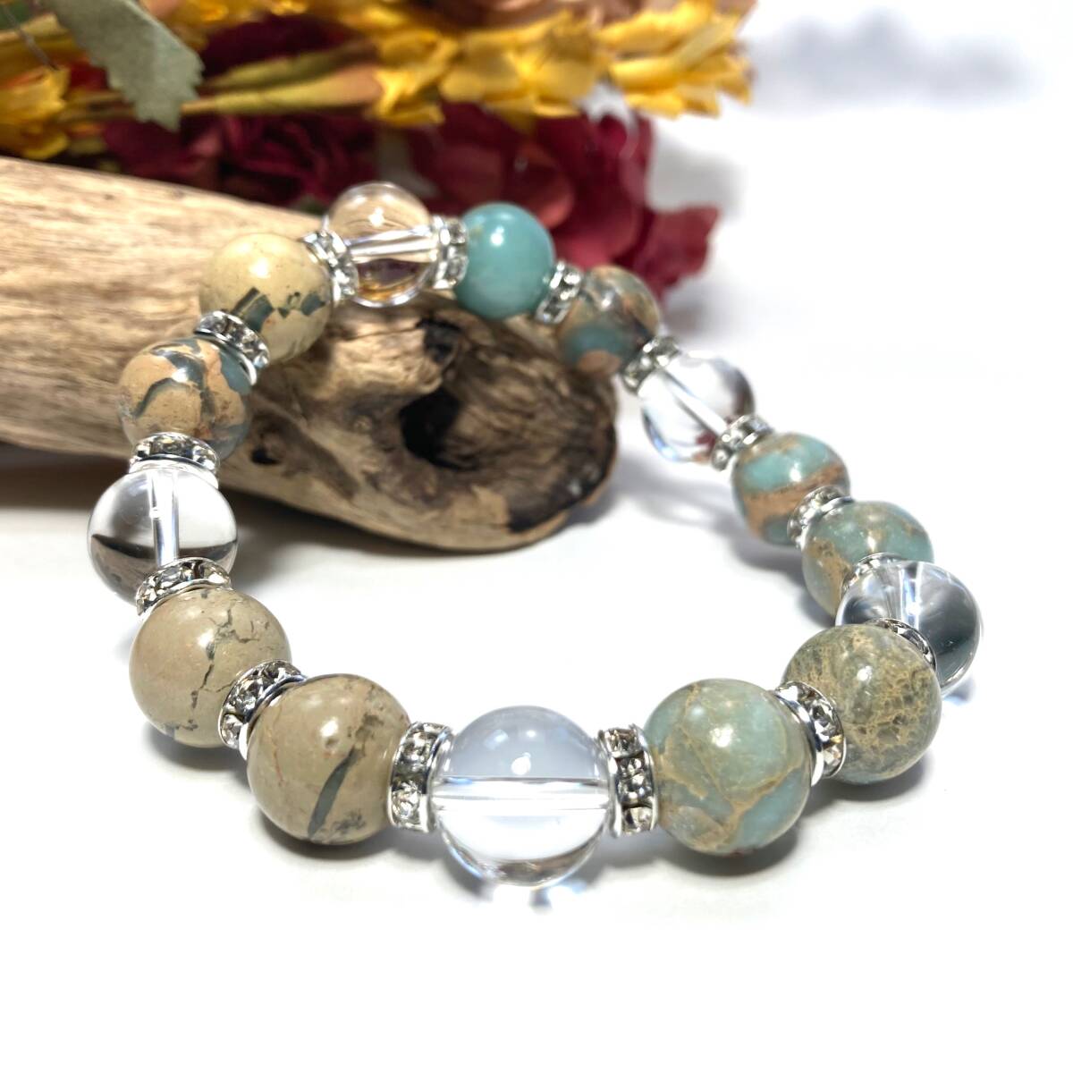 - インプレッションストーン&水晶 パワーストーン ブレスレット 天然石ブレス (シルバー) 12mm 幸運 開運 メンズ 男性♪