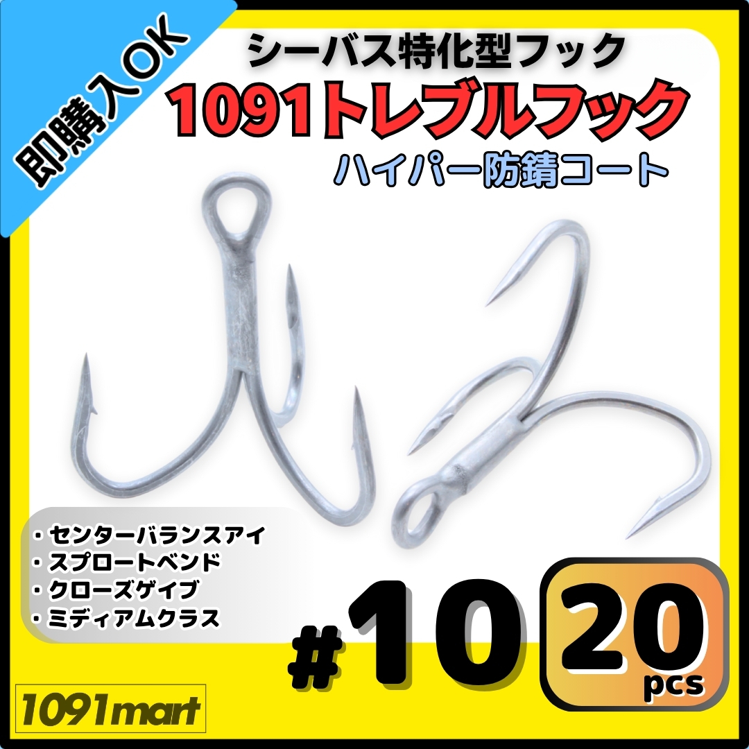 - 【送料無料】1091トレブルフック ハイパー防錆コート #10 20本セット 錆に強くバラしにくい シーバス特化型 トリプルフック ルアーフック
