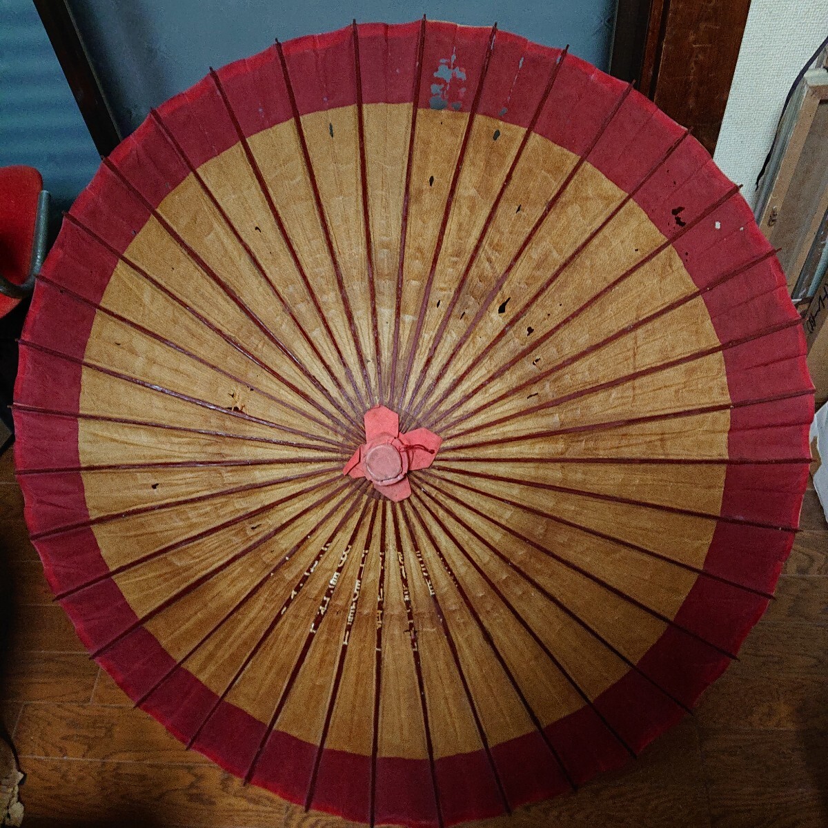 - 【和傘】番傘 径約100cm 二段階開閉 赤系 紙傘 蛇の目 舞台 コスプレ 撮影用 和装小物 小道具 当時物 現状品 ぷらみ 0928 147