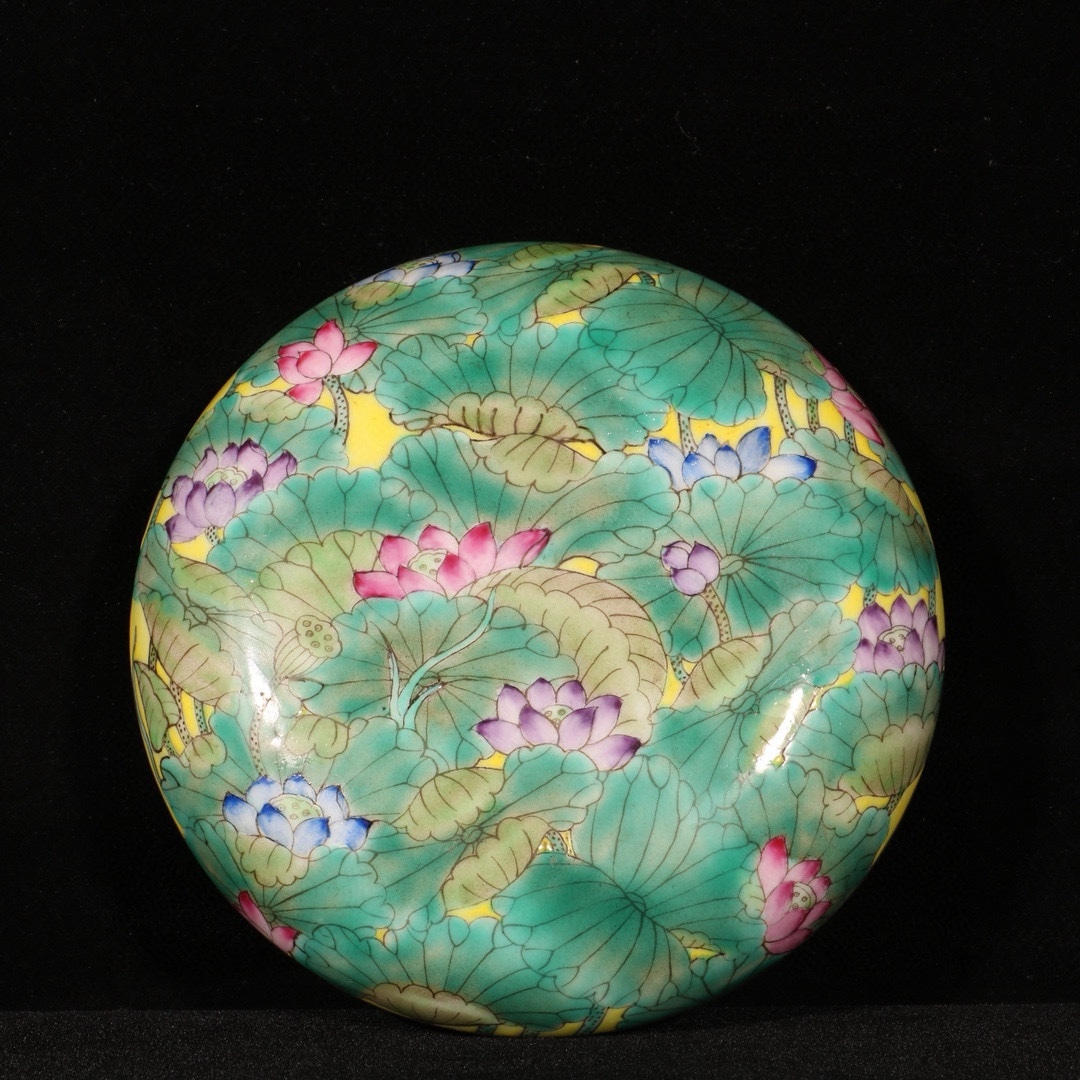 - 清時代 雍正 粉彩 荷花 粉盒 唐物 箱付き 陶磁器 中国美術 古美術 置物 骨董品 高さ4.5cm 直径13.8cm RG1091