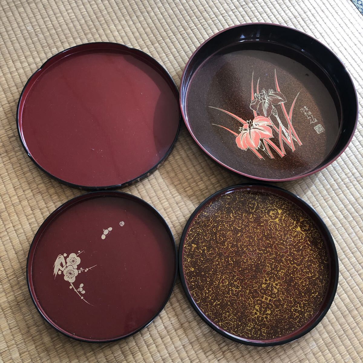 - 丸盆 四枚セット 漆器 桜皮細工 玉虫塗り 工芸品