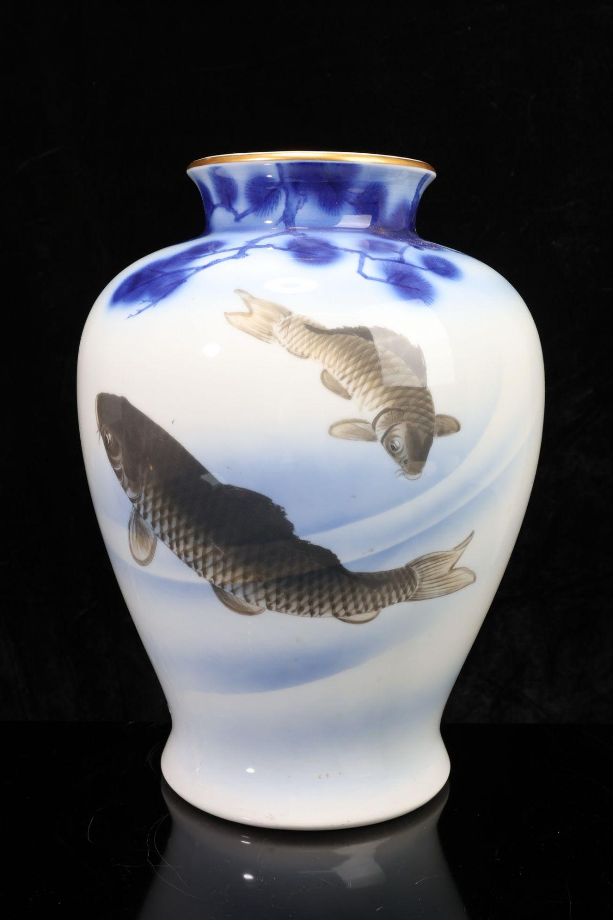 - 【珍品堂】1円から Y63-V05 有田焼 深川製磁 宮内庁御用達 松に双鯉 花瓶 高32cm 飾壺 花器 花入 置物 昭和レトロ 人気アイテム